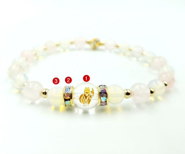 金の眷属神の入った8mm玉の大粒の水晶を中心に、ほのかなピンク色のローズクオーツ・オパール・クリスタルを使用した、非常に女性を意識した、可愛らしいデザインのブレスレットです。