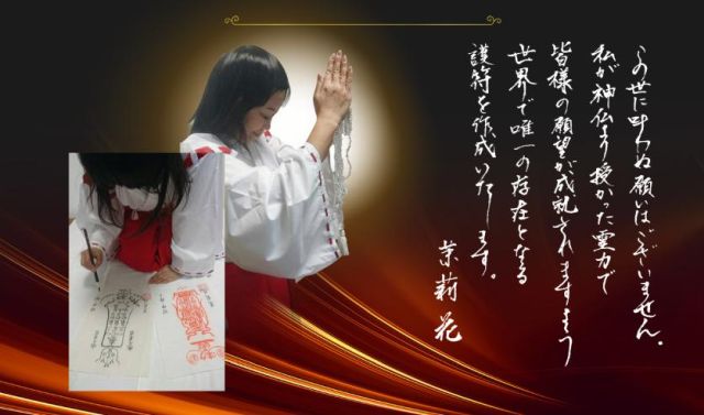 巫女の修行を積まれた茉莉花先生が、先生以外一切立ち入る事を禁じた命泉庵のご祈念所で、ご依頼者様の心願成就を祈念しながら、一枚一丁寧に、全身全霊を込めて、筆書きをしています。