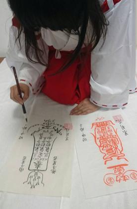 巫女の修行を積まれた茉莉花先生が、先生以外一切立ち入る事を禁じた命泉庵のご祈念所で、ご依頼者様の心願成就を祈念しながら、一枚一丁寧に、全身全霊を込めて、筆書きをしています。