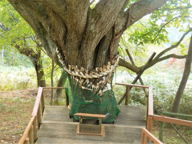 地元ではこのご霊木に触れると病気が治る。またはしゃもじに願いを書いて拝むと願いが叶うと言われています。